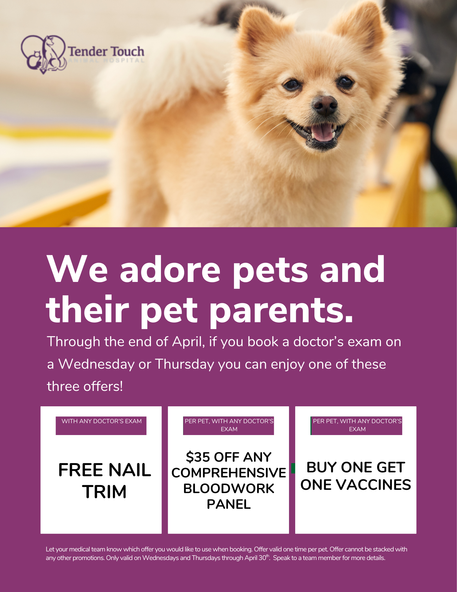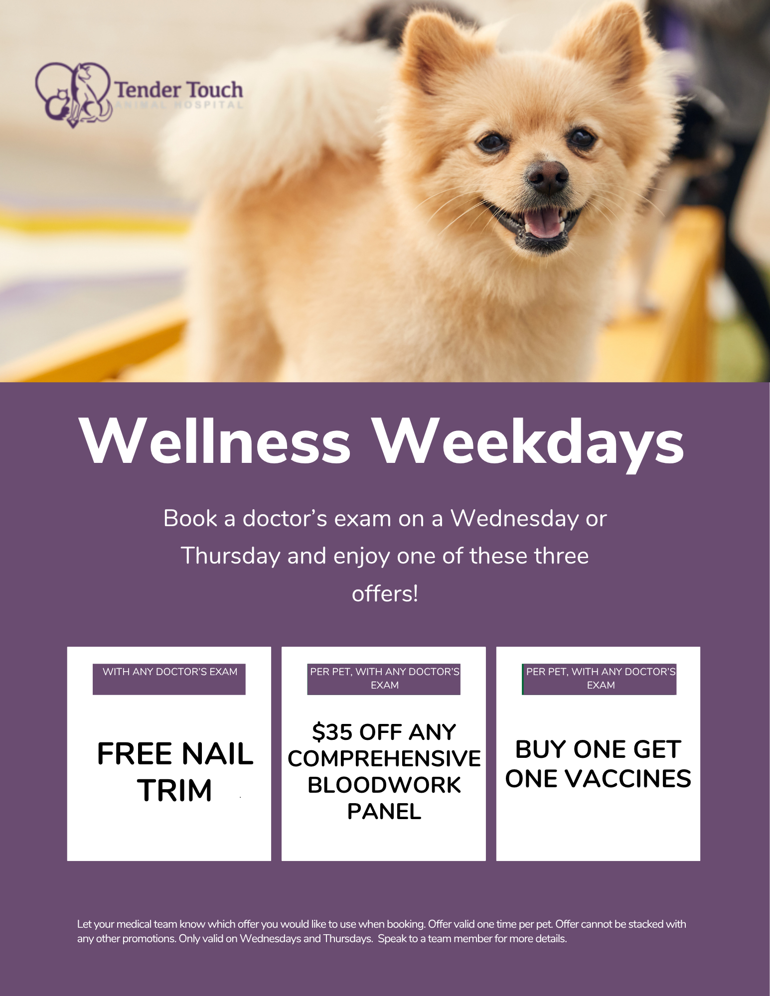 Pick between BOGO vaccines and $$ off preventative bloodwork on Wednesdays/Thursdays!